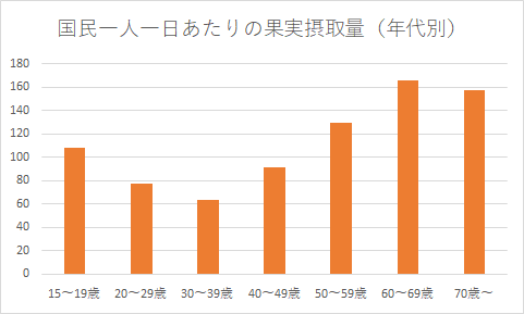 ですが近年、特に果実の摂取量が減少してきています。20~40代はその中でも摂取量が少ない年代になっています。