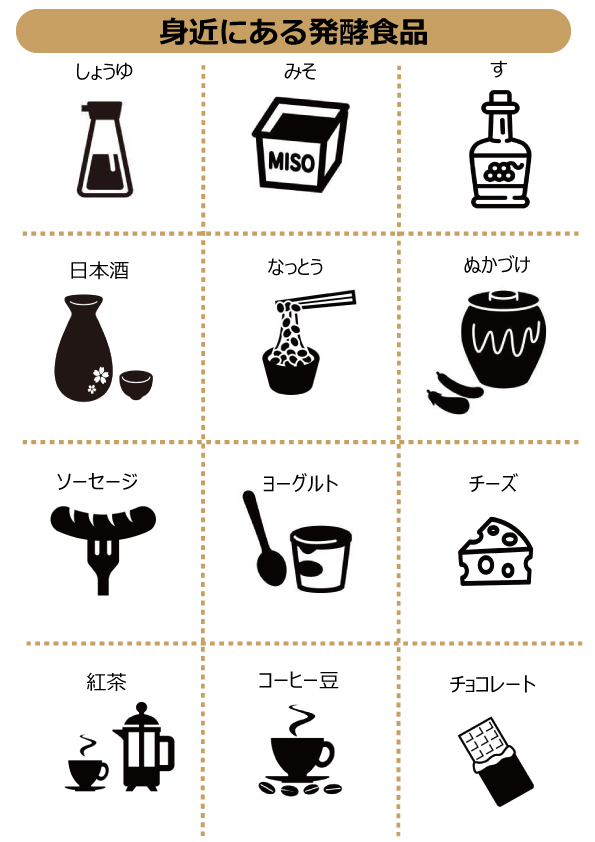 上記食品以外にも、ワインやサワークリーム・塩辛・キムチ・ウーロン茶・くずもち・甘酒等も発酵食品です