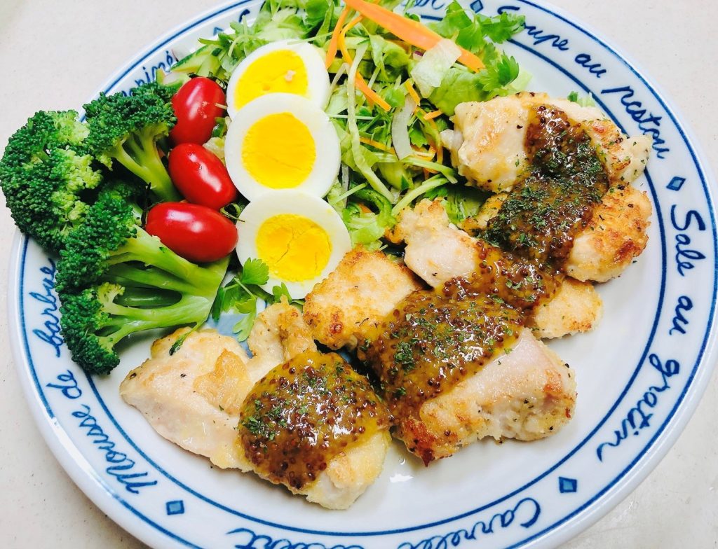 例えば写真のメニュー。鶏胸肉のマスタードソース。(もちろん野菜にもカリウムは含まれていますが)胸肉のパサつき防止のために周りに薄くグリーンバナナパウダーをまぶしています。また、マスタードソースにも小さじ一杯程度のグリーンバナナパウダーを添加しています。)