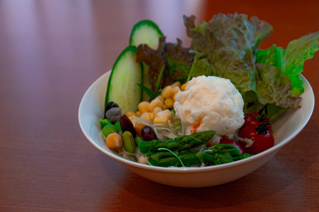 例えば写真のサラダなら、葉物野菜のレタスやキャベツから食べる方が望ましいです。