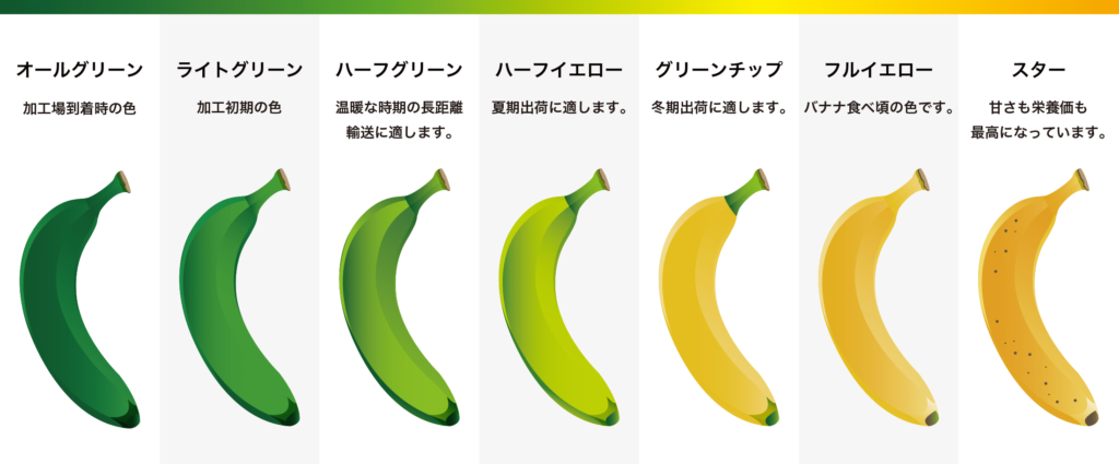 見てのとおり、バナナの表面の色を見れば明白です。ちなみに、左のグリーンバナナから右のイエローバナナになるにつれ、糖がでて甘みが増していきます。わたしたちが食べているバナナは、黄色に近いことが多いと思います。
