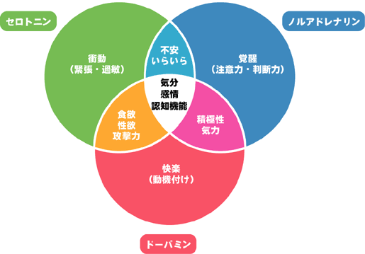 必須アミノ酸トリプトファンから生合成される脳内の神経伝達物質のひとつです。 視床下部や大脳基底核・延髄の縫線核などに高濃度に分布しています。 他の神経伝達物質であるドパミン(喜び、快楽など)やノルアドレナリン(恐怖、驚きなど)などの情報をコントロールし、精神を安定させる働きがあります。