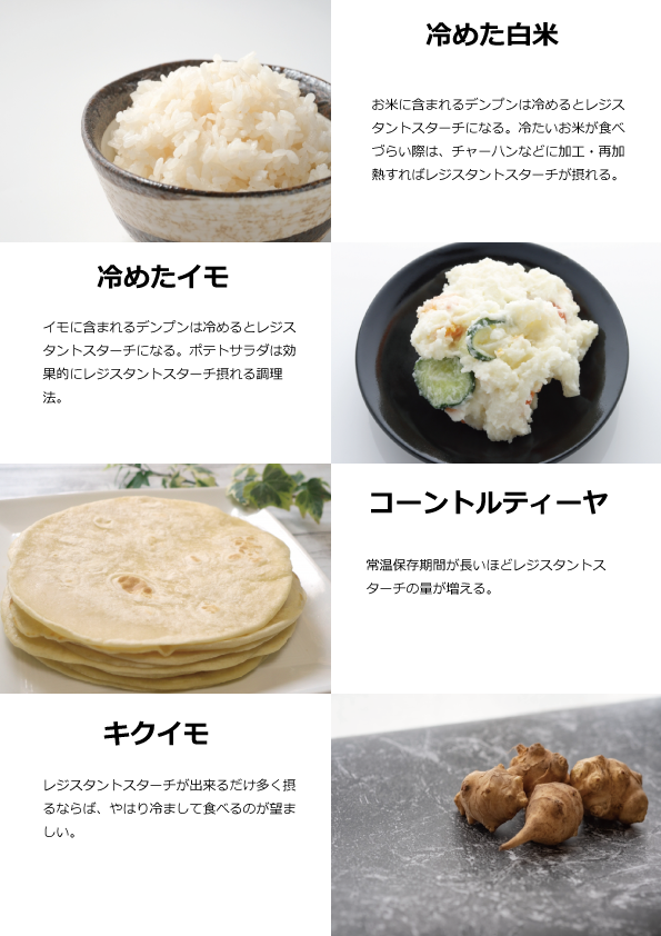 レジスタントスターチを多く含む食品を知り、上手に食事に摂り入れることで、血糖値上昇を抑制、大腸内で作り出した短鎖脂肪酸が時間差でエネルギーを作り出す、お腹の空きづらい食事をとることができます。