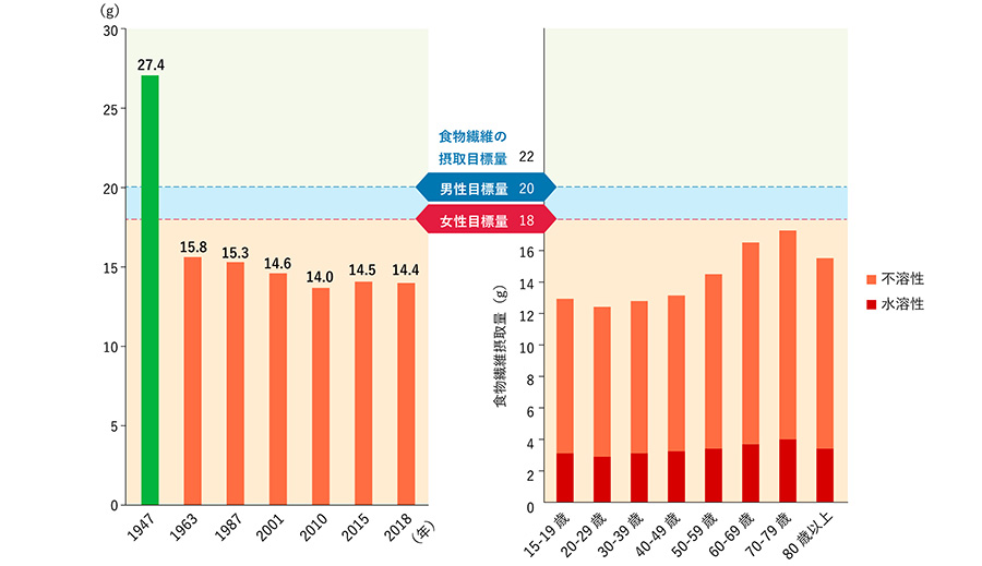 日本人の一日に必要な食物繊維の摂取量は男性が1日20g、女性が18gとされています。