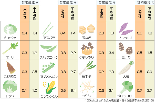 食物繊維には大きく分けると水に溶けやすい(水溶性)と水に溶けにくい(不溶性)の2種類があります。腸内細菌が好んでエサにするのは水溶性食物繊維です。