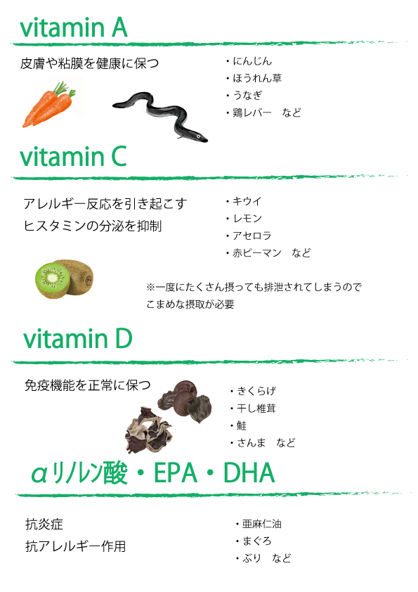花粉症対策に効果的な栄養素・食べ物をしって、バランスの良い食事を心がけましょう。