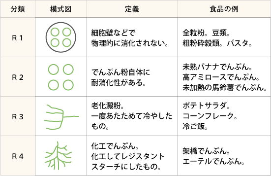 レジスタントスターチ(RS1, RS2, RS3, RS4) は4種類あり、グリーンバナナ以外にも雑穀や豆などにもレジスタントスターチは含まれています。レジスタントスターチ含有量はグリーンバナナが多く、グリーンバナナのレジスタントスターチはRS2に分類されます。